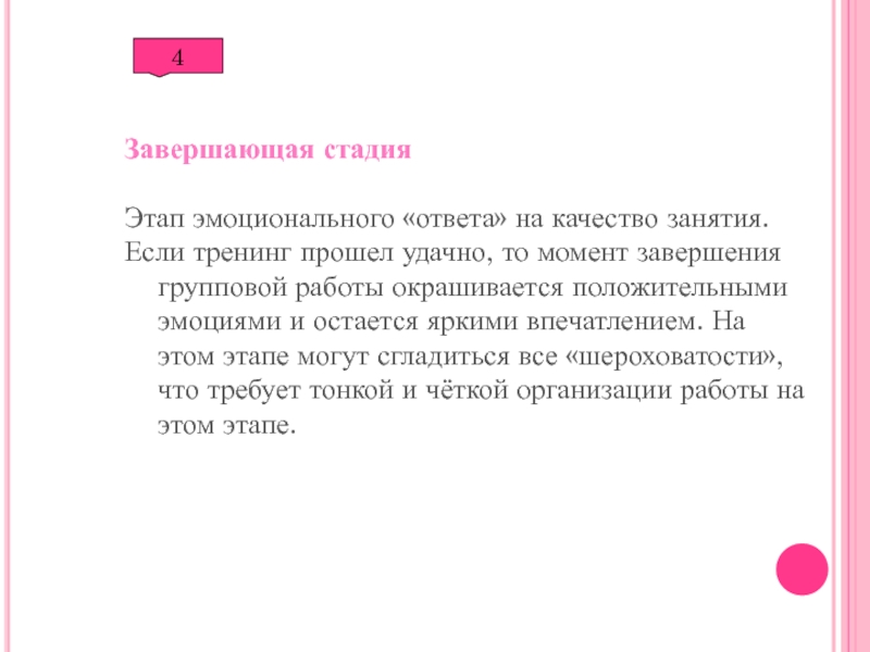 удачно, то момент завершения групповой работы окрашивается положительными эмоциями и остается яркими впечатлением. На этом этапе могут сгладиться все «шероховатости», что требует тонкой и чёткой организации работы на этом этапе.