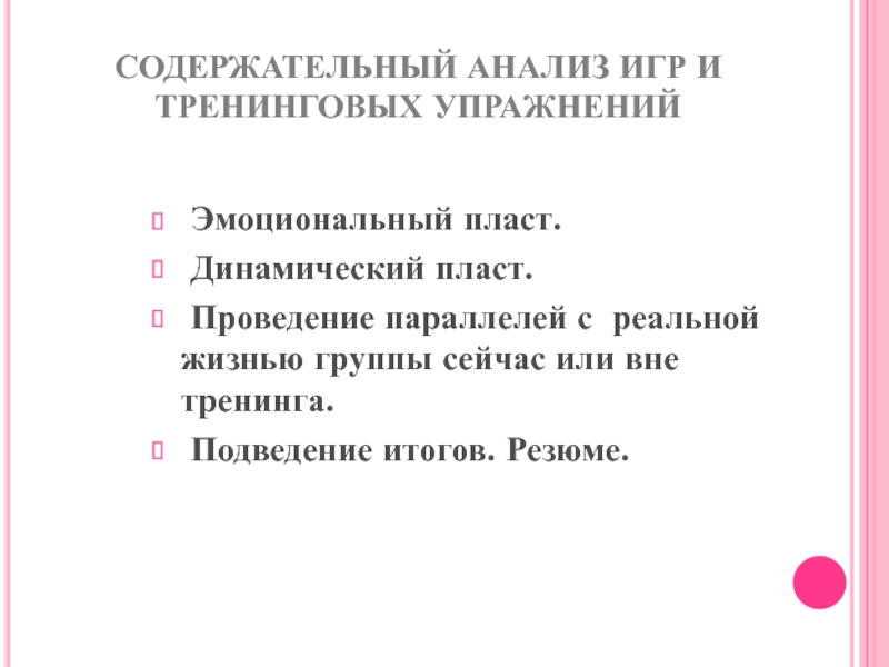 Слайд 12СОДЕРЖАТЕЛЬНЫЙ АНАЛИЗ ИГР И ТРЕНИНГОВЫХ УПРАЖНЕНИЙ