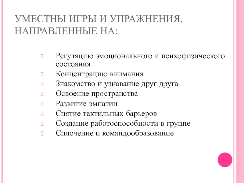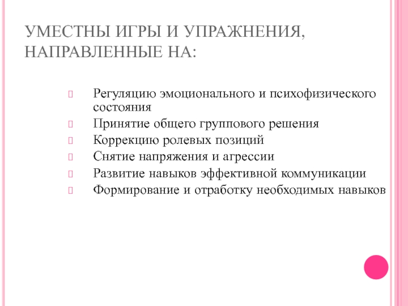 Слайд 19УМЕСТНЫ ИГРЫ И УПРАЖНЕНИЯ, НАПРАВЛЕННЫЕ НА: