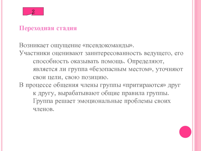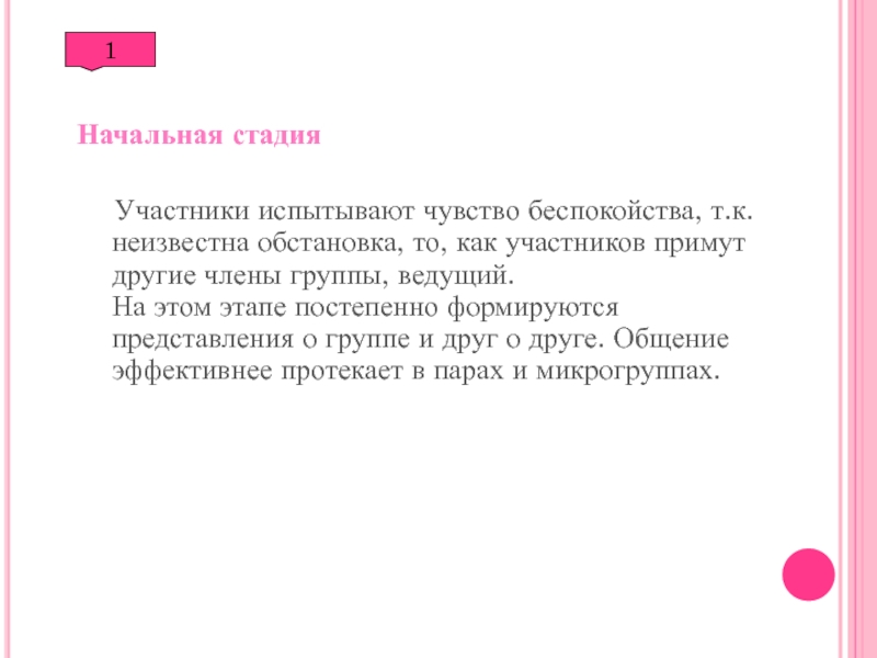 На этом этапе постепенно формируются представления о группе и друг о друге. Общение эффективнее протекает в парах и микрогруппах.