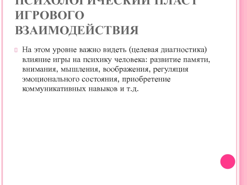 Слайд 8ПСИХОЛОГИЧЕСКИЙ ПЛАСТ ИГРОВОГО ВЗАИМОДЕЙСТВИЯ