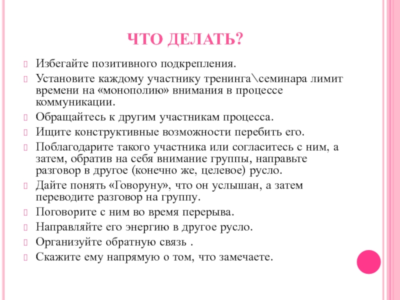 Поблагодарите такого участника или согласитесь с ним, а затем, обратив на себя внимание группы, направьте разговор в другое (конечно же, целевое) русло.