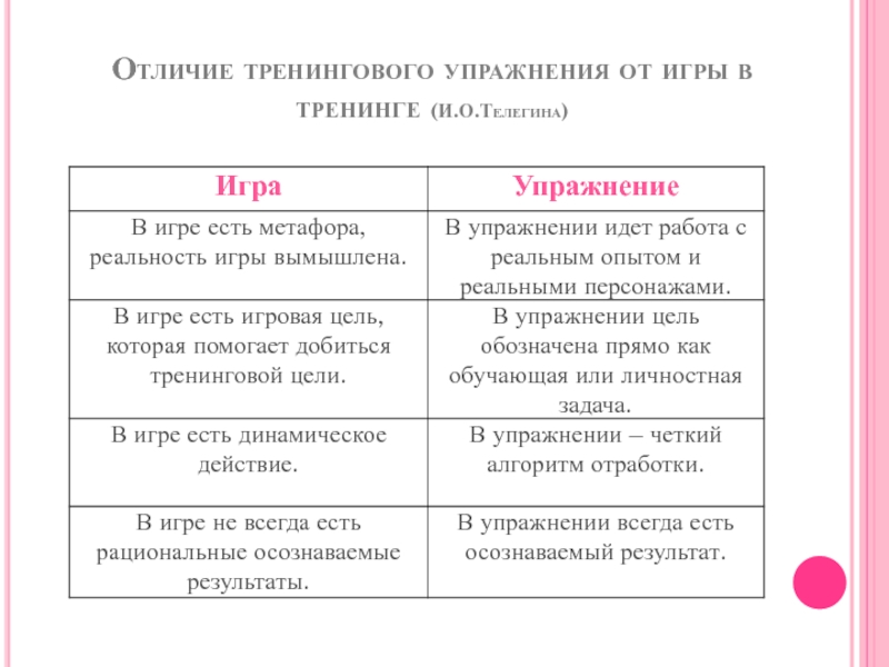 Слайд 4Отличие тренингового упражнения от игры в тренинге (И.О.Телегина)