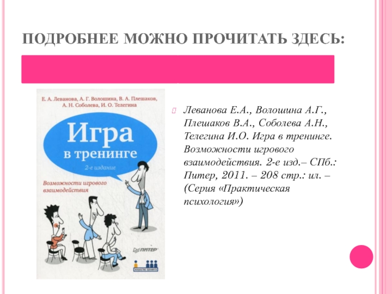 Телегина И.О. Игра в тренинге. Возможности игрового взаимодействия. 2-е изд.– СПб.: Питер, 2011. – 208 стр.: ил. – (Серия «Практическая психология»)