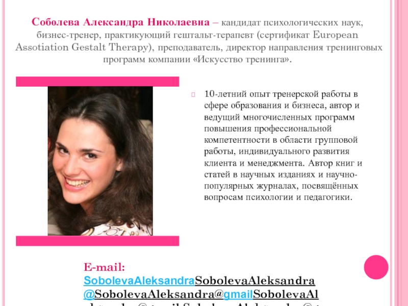Соболева Александра Николаевна – кандидат психологических наук, бизнес-тренер, практикующий гештальт-терапевт