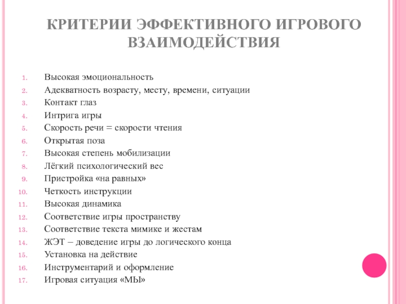 Слайд 11КРИТЕРИИ ЭФФЕКТИВНОГО ИГРОВОГО ВЗАИМОДЕЙСТВИЯ