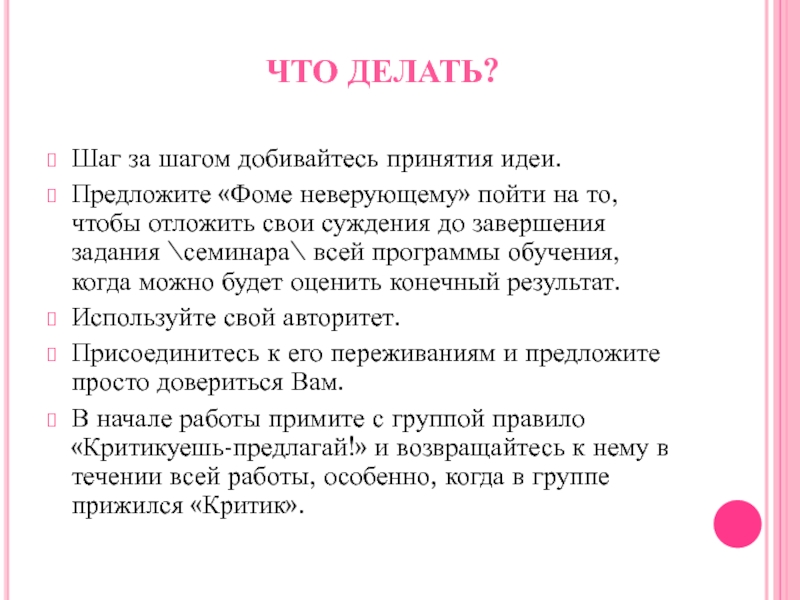 В начале работы примите с группой правило «Критикуешь-предлагай!» и возвращайтесь к нему в течении всей работы, особенно, когда в группе прижился «Критик».