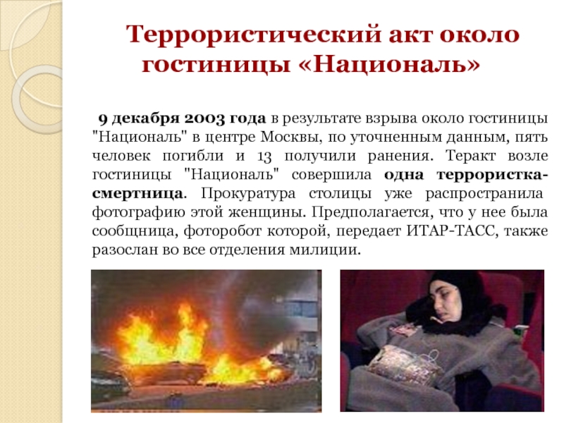 около гостиницы "Националь" в центре Москвы, по уточненным данным, пять человек погибли и 13 получили ранения. Теракт возле гостиницы "Националь" совершила одна террористка-смертница. Прокуратура столицы уже распространила фотографию этой женщины. Предполагается, что у нее была сообщница, фоторобот которой, передает ИТАР-ТАСС, также разослан во все отделения милиции.