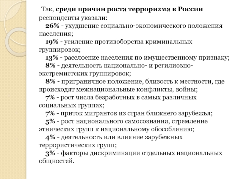 Слайд 5 Так, среди причин роста терроризма в России респонденты указали: