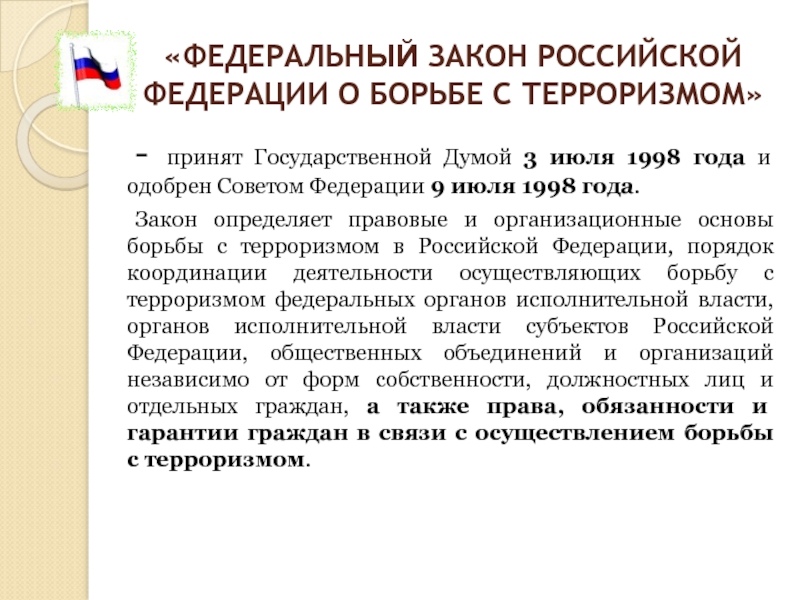 Слайд 20«ФЕДЕРАЛЬНЫЙ ЗАКОН РОССИЙСКОЙ ФЕДЕРАЦИИ О БОРЬБЕ С ТЕРРОРИЗМОМ»