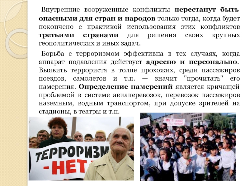Слайд 19 Внутренние вооруженные конфликты перестанут быть опасными для стран и народов только