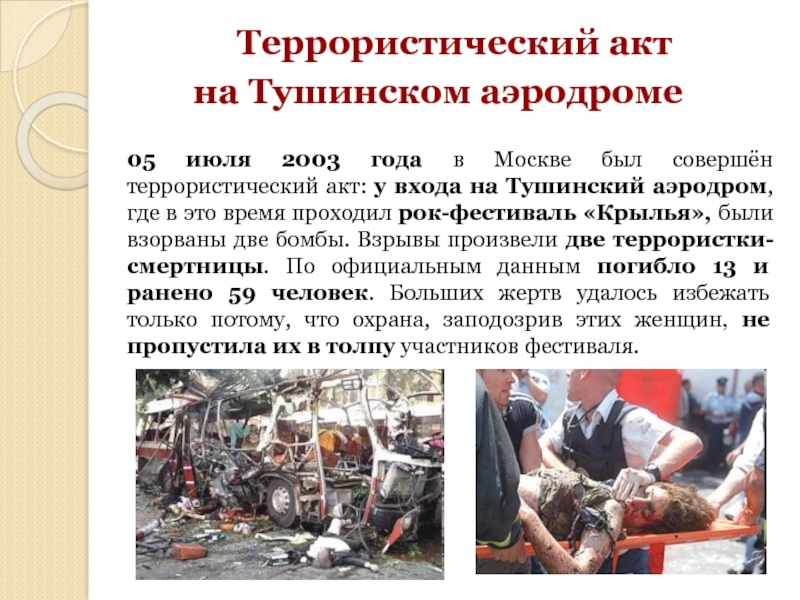 совершён террористический акт: у входа на Тушинский аэродром, где в это время проходил рок-фестиваль «Крылья», были взорваны две бомбы. Взрывы произвели две террористки-смертницы. По официальным данным погибло 13 и ранено 59 человек. Больших жертв удалось избежать только потому, что охрана, заподозрив этих женщин, не пропустила их в толпу участников фестиваля.