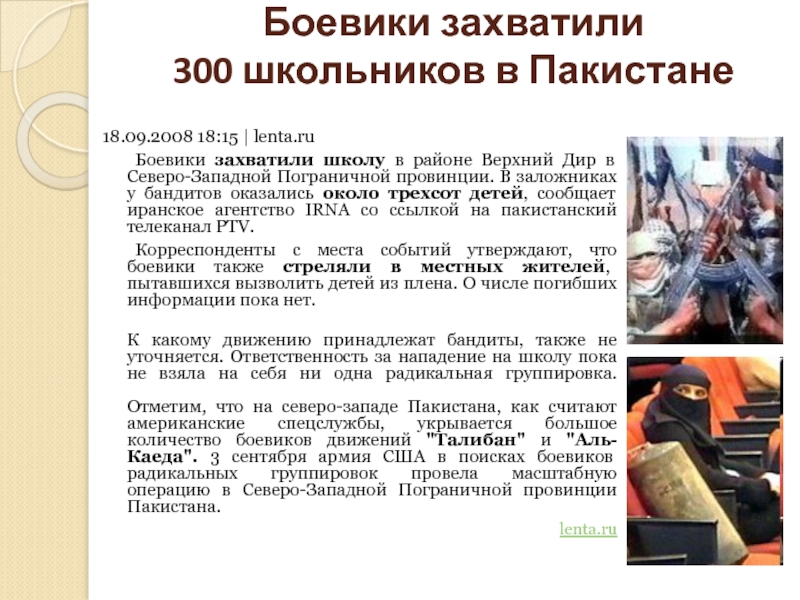 Отметим, что на северо-западе Пакистана, как считают американские спецслужбы, укрывается большое количество боевиков движений "Талибан" и "Аль-Каеда". 3 сентября армия США в поисках боевиков радикальных группировок провела масштабную операцию в Северо-Западной Пограничной провинции Пакистана.