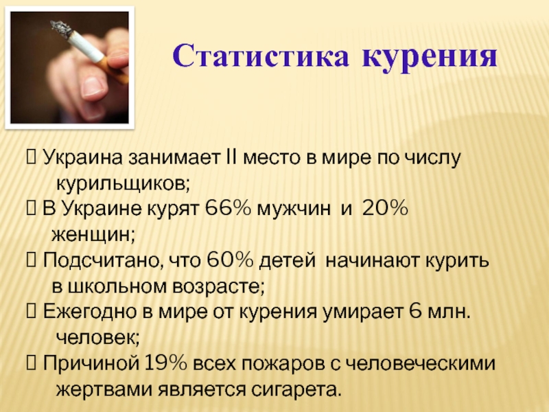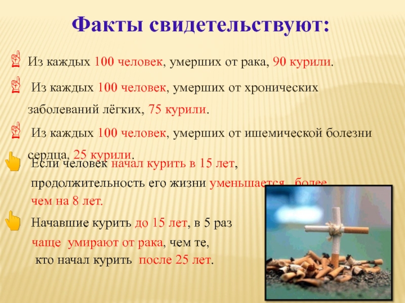 Если человек начал курить в 15 лет, продолжительность его жизни уменьшается более чем на 8 лет.