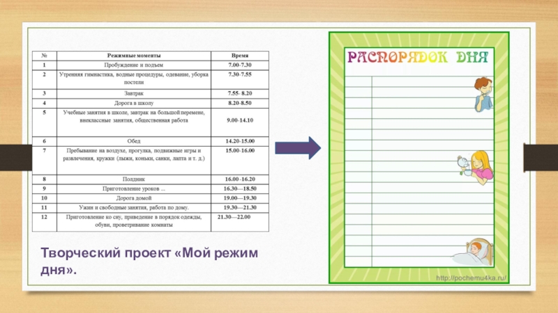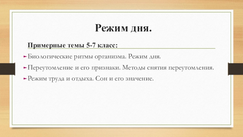 Режим дня : Биологические ритмы организма. Режим дня. Переутомление и его признаки. Методы снятия переутомления. Режим труда и отдыха. Сон и его значение. Гиподинамия. Проект «Мой режим дня».