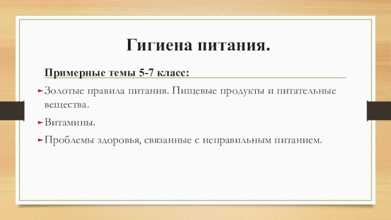 Гигиена питания :Питание – необходимое условие для жизни человека. Золотые правила питания. Пищевые продукты и питательные вещества. Витамины. Болезни, вызванные неправильным питанием. Проект «Классный завтрак».