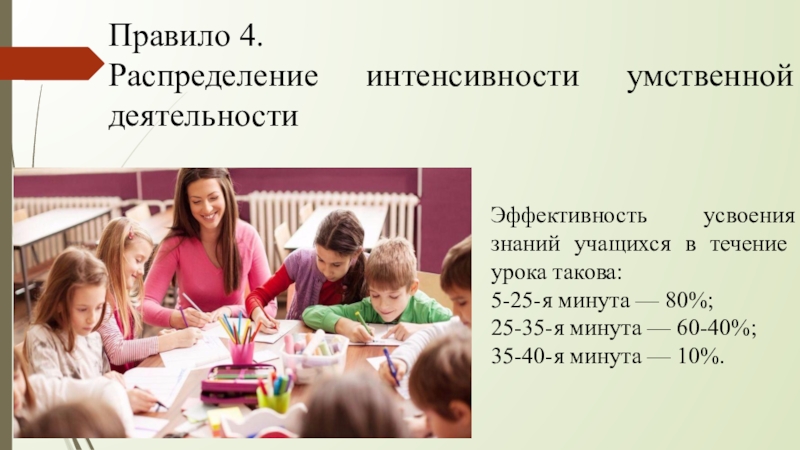 Правило 4. Распределение интенсивности умственной деятельностиЭффективность усвоения знаний учащихся в тече­ние урока такова:5-25-я минута — 80%;25-35-я минута