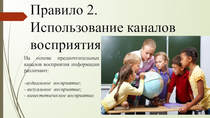 Правило 2. Использование каналов восприятияНа основе предпочтительных каналов восприятия информации различают: -аудиальное восприятие; - визуальное восприятие; -