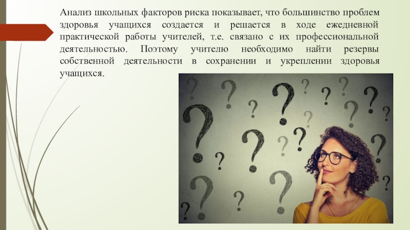 Слайд 2Анализ школьных факторов риска показывает, что большинство проблем здоровья учащихся создается