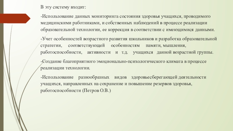 -Использование    разнообразных    видов    здоровьесберегающей деятельности учащихся, направленных на сохранение и повышение резервов здоровья, работоспособности (Петров О.В.)