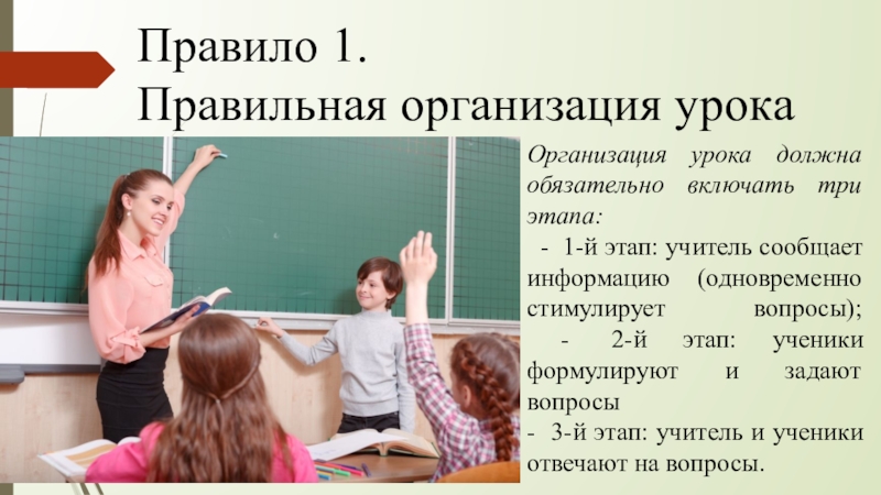Правило 1. Правильная организация урока Организация урока должна обязательно включать три этапа:  -  1-й этап: учитель