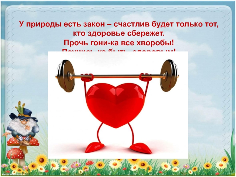 У природы есть закон – счастлив будет только тот, кто здоровье сбережет. Прочь гони-ка все хворобы! Поучись-ка