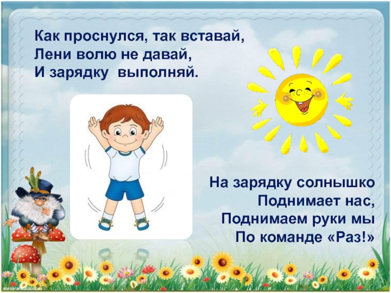 Как проснулся, так вставай,Лени волю не давай,И зарядку выполняй.На зарядку солнышко Поднимает нас,Поднимаем руки мыПо команде «Раз!»