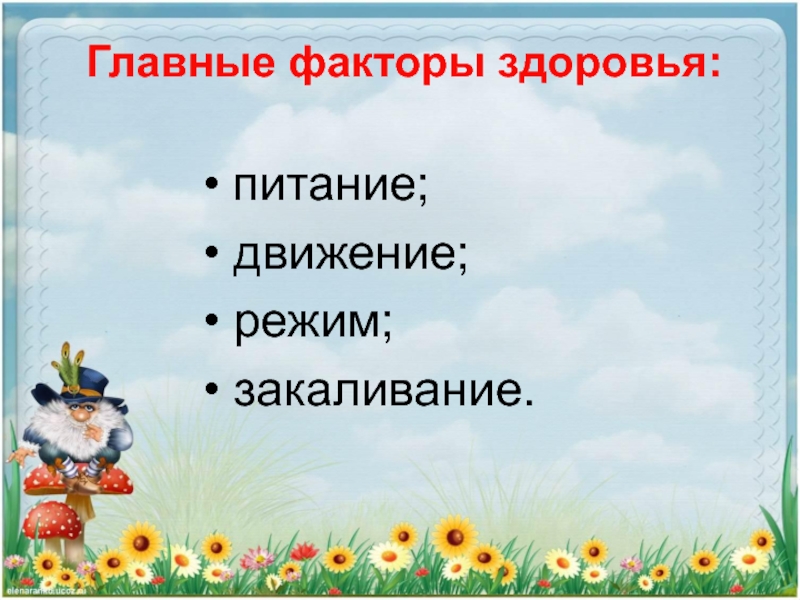 Главные факторы здоровья: питание; движение; режим; закаливание.