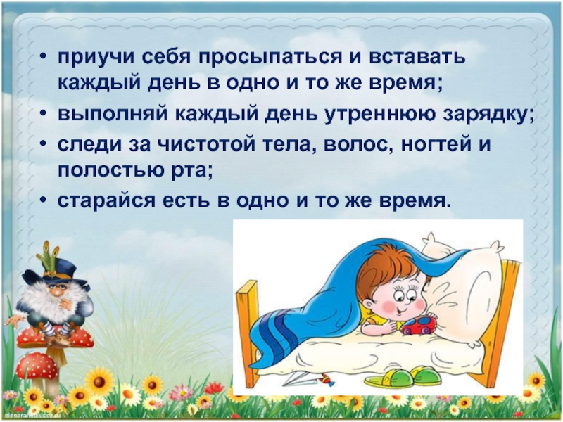 Слайд 8приучи себя просыпаться и вставать каждый день в одно и то