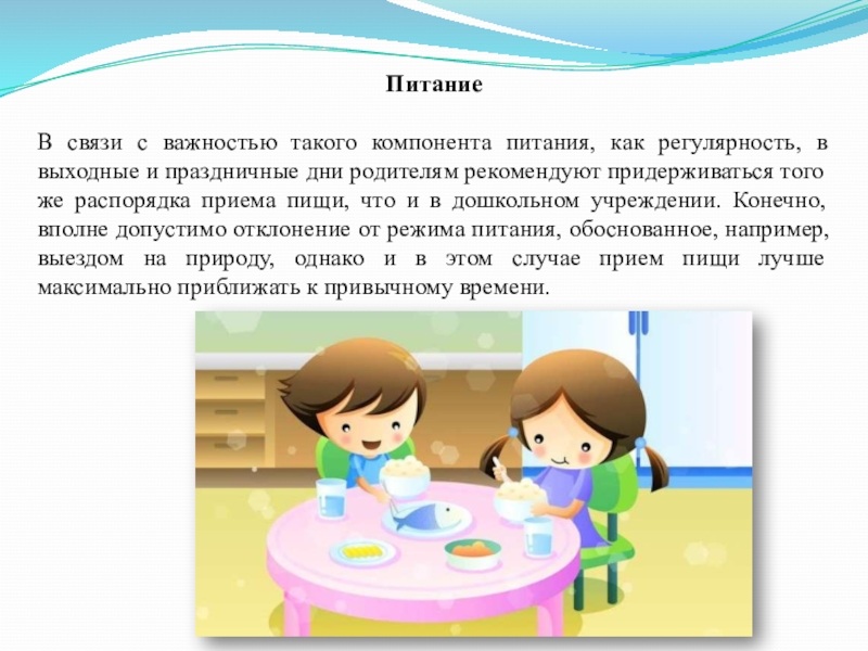 и праздничные дни родителям рекомендуют придерживаться того же распорядка приема пищи, что и в дошкольном учреждении. Конечно, вполне допустимо отклонение от режима питания, обоснованное, например, выездом на природу, однако и в этом случае прием пищи лучше максимально приближать к привычному времени.