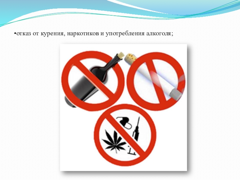 Слайд 9отказ от курения, наркотиков и употребления алкоголя;