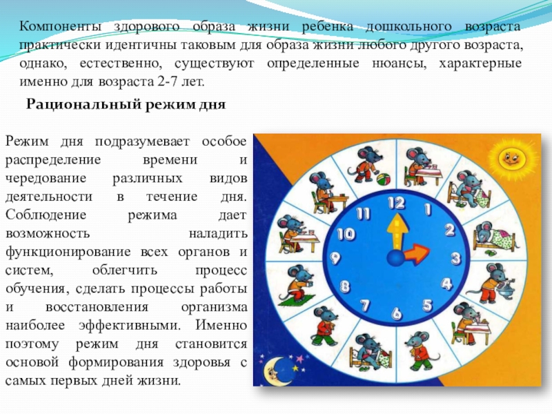 Режим дня подразумевает особое распределение времени и чередование различных видов деятельности в течение дня. Соблюдение режима дает возможность наладить функционирование всех органов и систем, облегчить процесс обучения, сделать процессы работы и восстановления организма наиболее эффективными. Именно поэтому режим дня становится основой формирования здоровья с самых первых дней жизни.