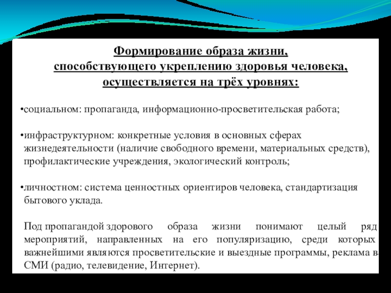 инфраструктурном: конкретные условия в основных сферах жизнедеятельности (наличие свободного времени, материальных средств), профилактические учреждения, экологический контроль;