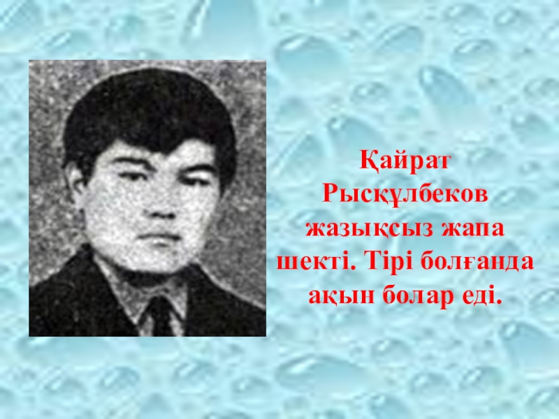 Слайд 5Қайрат Рысқұлбеков жазықсыз жапа шекті. Тірі болғанда ақын болар еді.