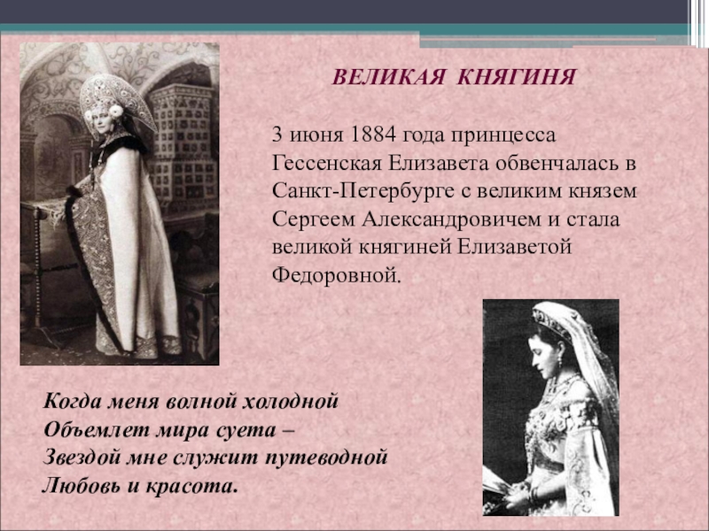 3 июня 1884 года принцесса Гессенская Елизавета обвенчалась в Санкт-Петербурге с великим князем Сергеем Александровичем и стала великой княгиней Елизаветой Федоровной.