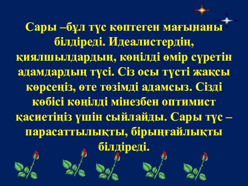 Слайд 9Сары –бұл түс көптеген мағынаны білдіреді. Идеалистердің, қиялшылдардың, көңілді өмір сүретін