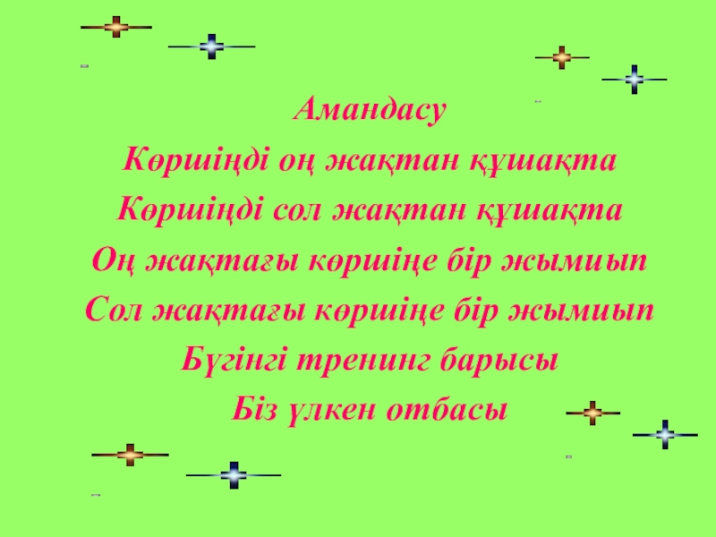 АмандасуКөршіңді оң жақтан құшақтаКөршіңді сол жақтан құшақтаОң жақтағы көршіңе бір жымиыпСол жақтағы көршіңе бір жымиыпБүгінгі тренинг барысы