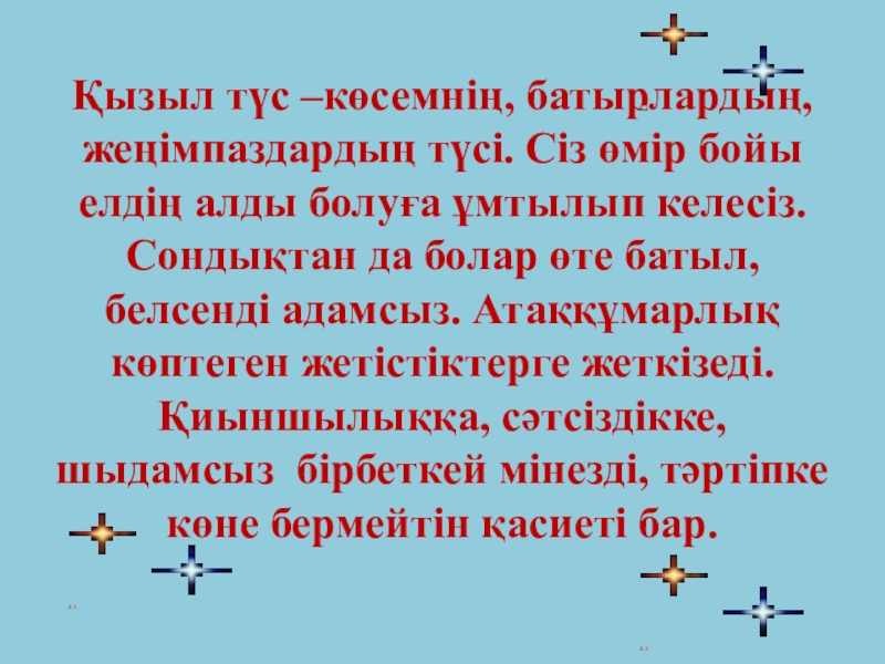 Слайд 7Қызыл түс –көсемнің, батырлардың, жеңімпаздардың түсі. Сіз өмір бойы елдің алды