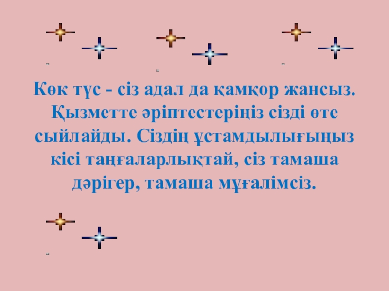 Слайд 8Көк түс - сіз адал да қамқор жансыз. Қызметте әріптестеріңіз сізді