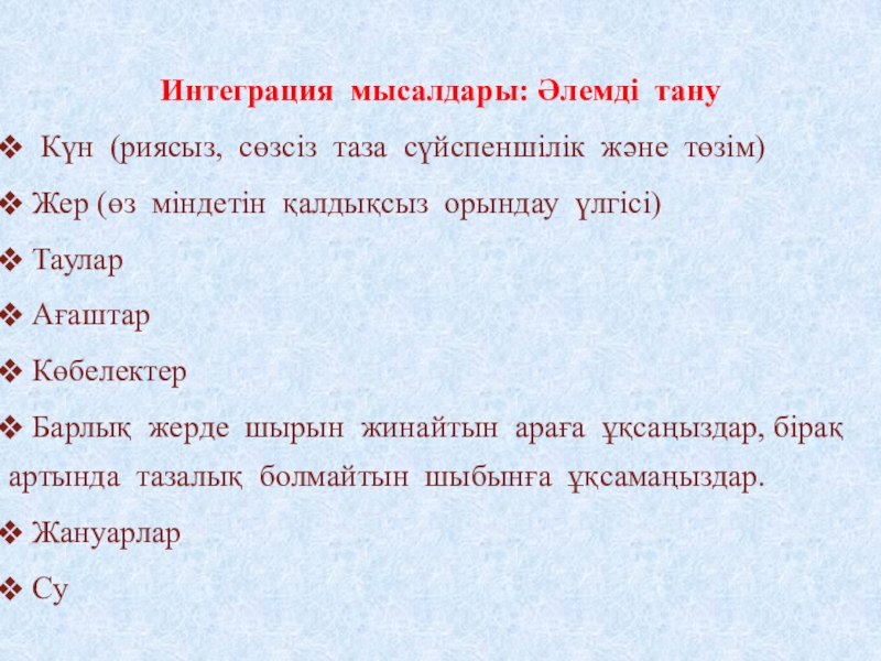 Адамгершілік қасиеттерге ізгілікке, қайырымдылыққа, адалдыққа т.б тәрбиелеу;
