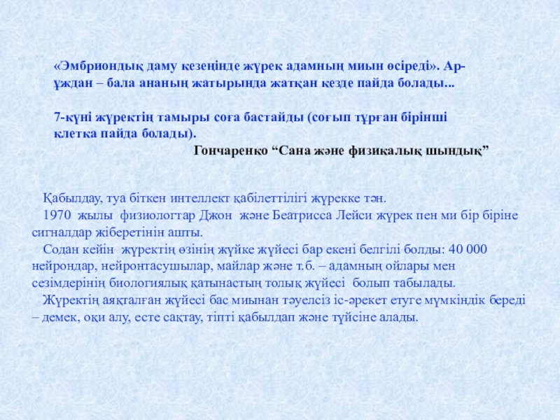 Содан кейін жүректің өзінің жүйке жүйесі бар екені белгілі болды: 40 000 нейрондар, нейронтасушылар, майлар және т.б. – адамның ойлары мен сезімдерінің биологиялық қатынастың толық жүйесі болып табылады.