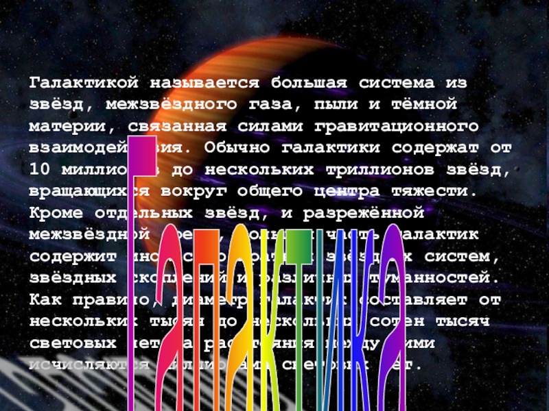 При таких условиях не могут существовать ни макротела, ни молекулы, ни атомы. Звезды существуют не изолированно, а в виде гигантских скоплений, которые называются галактиками. В настоящее время насчитывается около 10 миллиардов галактик. Наша Солнечная система находится внутри одной из них.