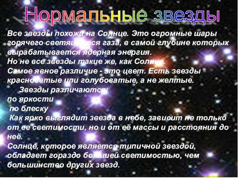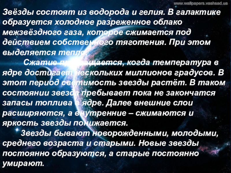 3везды бывают новорожденными, молодыми, среднего возраста и старыми. Новые звезды постоянно образуются, а старые постоянно умирают.