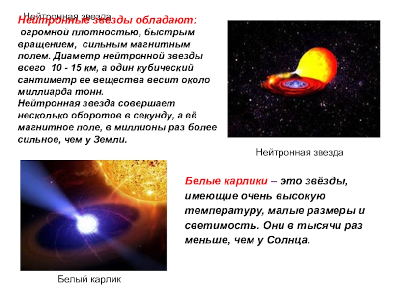Белые карлики – это звёзды, имеющие очень высокую температуру, малые размеры и светимость. Они в тысячи раз меньше, чем у Солнца.