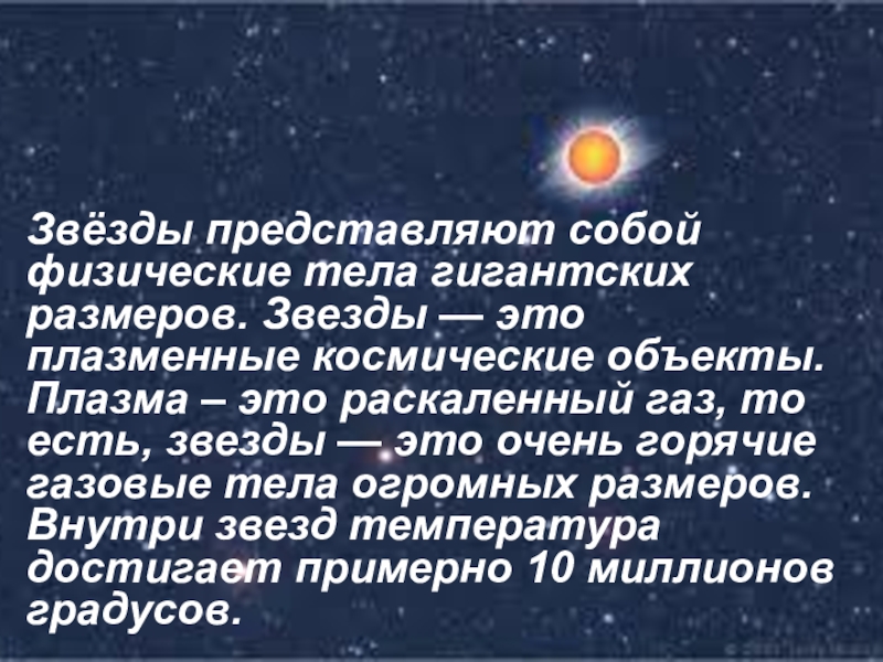 Звёзды представляют собой физические тела гигантских размеров. Звезды — это плазменные космические объекты. Плазма – это раскаленный газ, то есть, звезды — это очень горячие газовые тела огромных размеров. Внутри звезд температура достигает примерно 10 миллионов градусов.