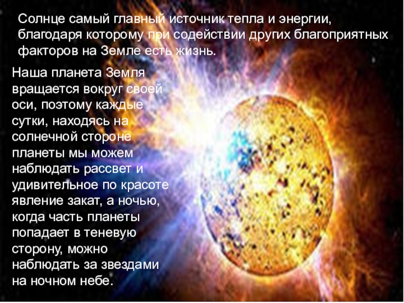 Солнце самый главный источник тепла и энергии, благодаря которому при содействии других благоприятных факторов на Земле есть жизнь.