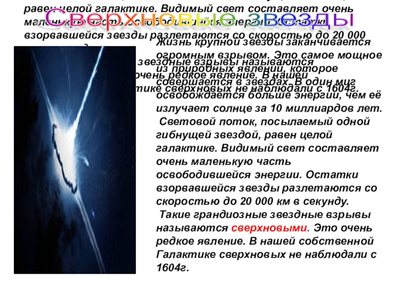 Такие грандиозные звездные взрывы называются сверхновыми. Это очень редкое явление. В нашей собственной Галактике сверхновых не наблюдали с 1604г.