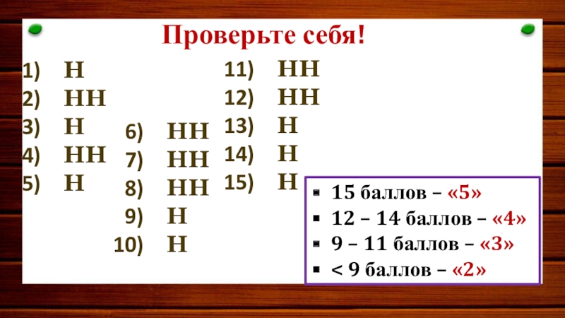 Проверьте себя!ННННННННННННННН15 баллов – «5»12 – 14 баллов – «4»9 – 11 баллов – «3»< 9 баллов