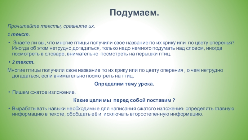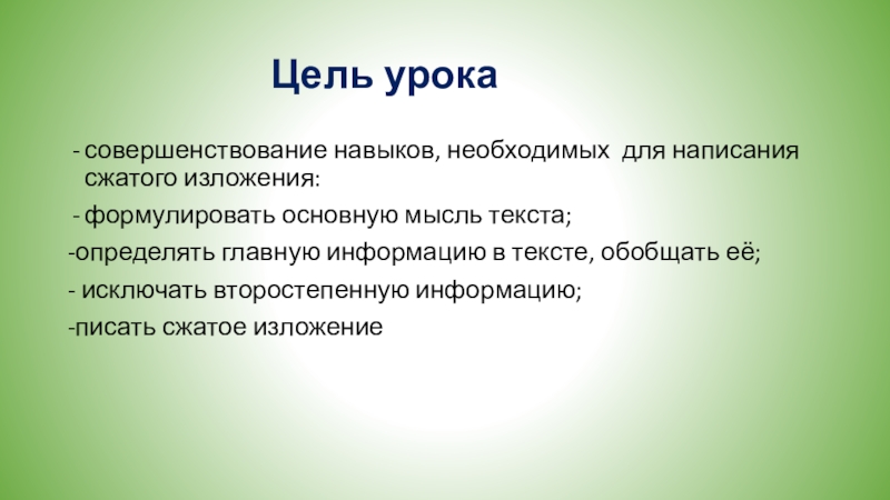 Вырабатывать навыки необходимые для написания сжатого изложения: определять главную информацию в тексте, обобщать её и исключать второстепенную информацию.
