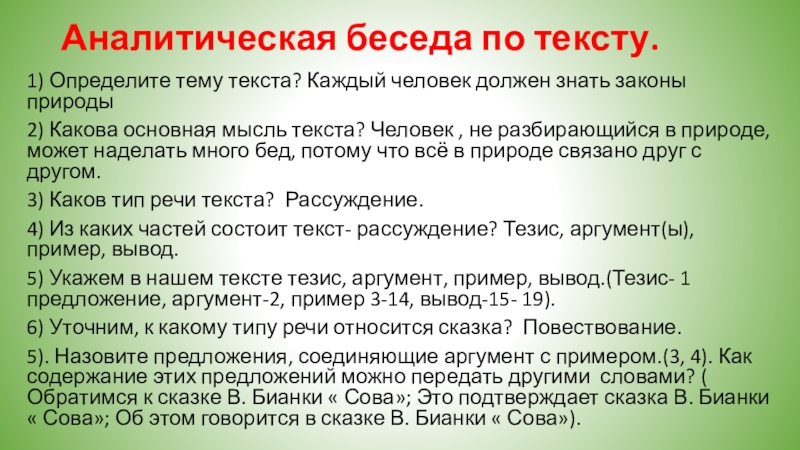 Слайд 7Аналитическая беседа по тексту.